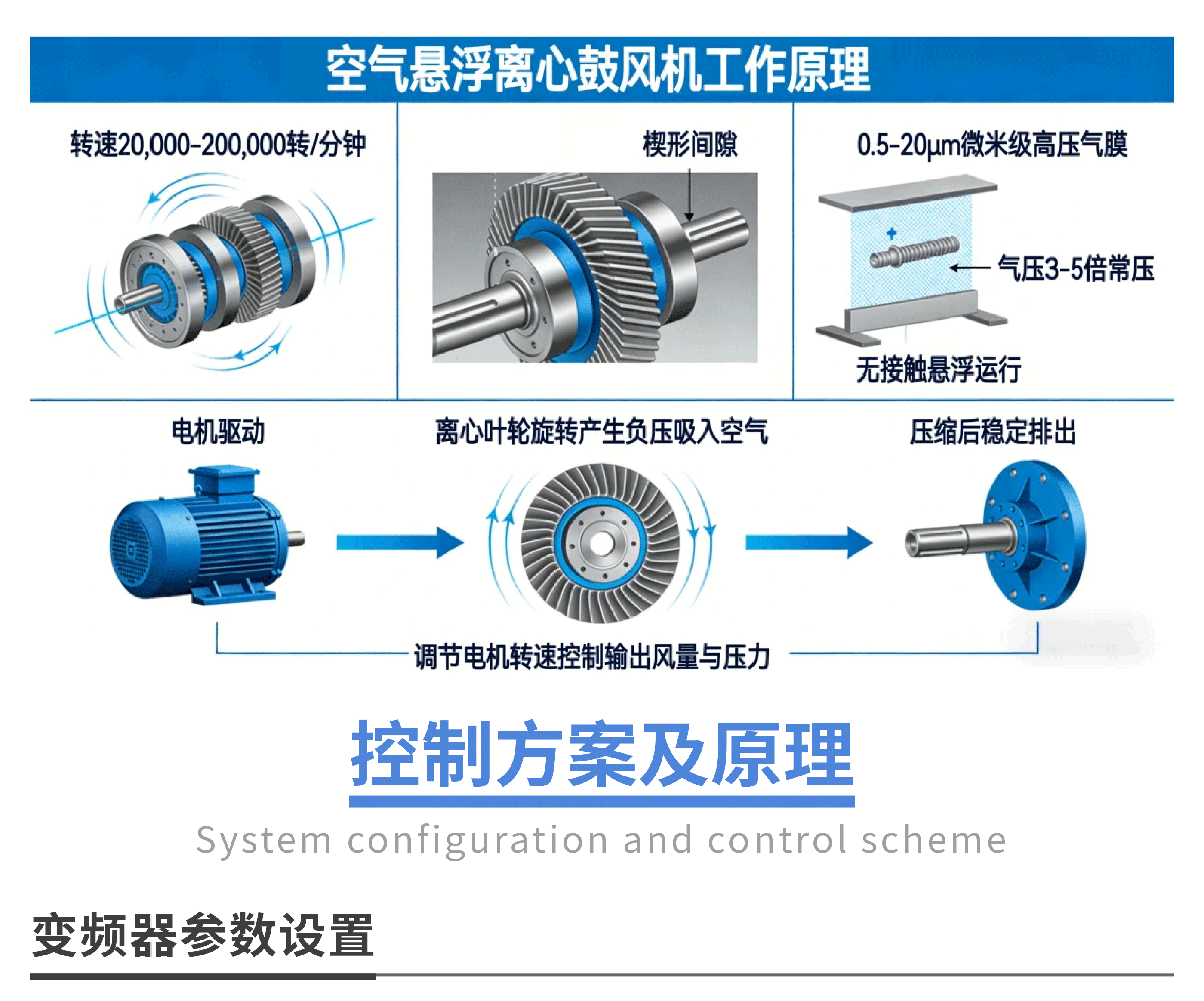 随着环保政策收紧与工业节能转型推进,空气悬浮离心鼓风机凭借无接触悬浮运行、低噪节能、气源洁净的核心优势,在污水处理曝气、化工反应供气、电子洁净车间通风等对气源质量与能耗要求严苛的场景中广泛应用。其依赖空气悬浮轴承技术实现超高转速运行,传统控制方式难以匹配精准调速需求,易出现启停冲击大、气压波动、能耗偏高等问题。