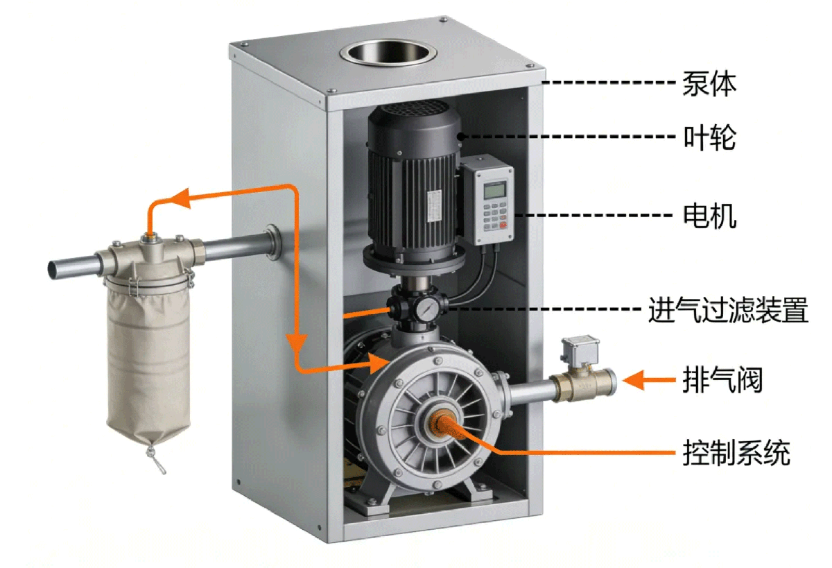 单级真空泵核心由泵体、叶轮、电机、进气过滤装置、排气阀及控制系统构成。泵体为气体压缩核心,叶轮旋转实现气体抽吸与压缩,电机提供动力输出,FR500 变频器负责转速精准调控,进气过滤装置保障气体洁净度,各部件协同实现稳定的真空抽取作业。