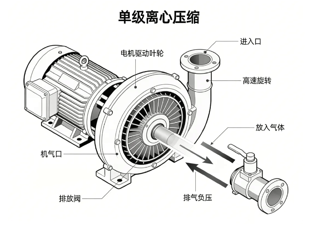 单级真空泵采用 “单级离心压缩” 原理,电机驱动叶轮高速旋转时,泵体内形成负压,通过进气口吸入待抽真空环境的气体;气体在叶轮离心力作用下被压缩,压力升高后通过排气阀排出泵外,形成稳定的真空环境。通过调节电机转速,可实现抽气速率与真空度的无级调节,适配不同工况下的真空需求,如食品包装的浅真空、医药干燥的中高真空等。