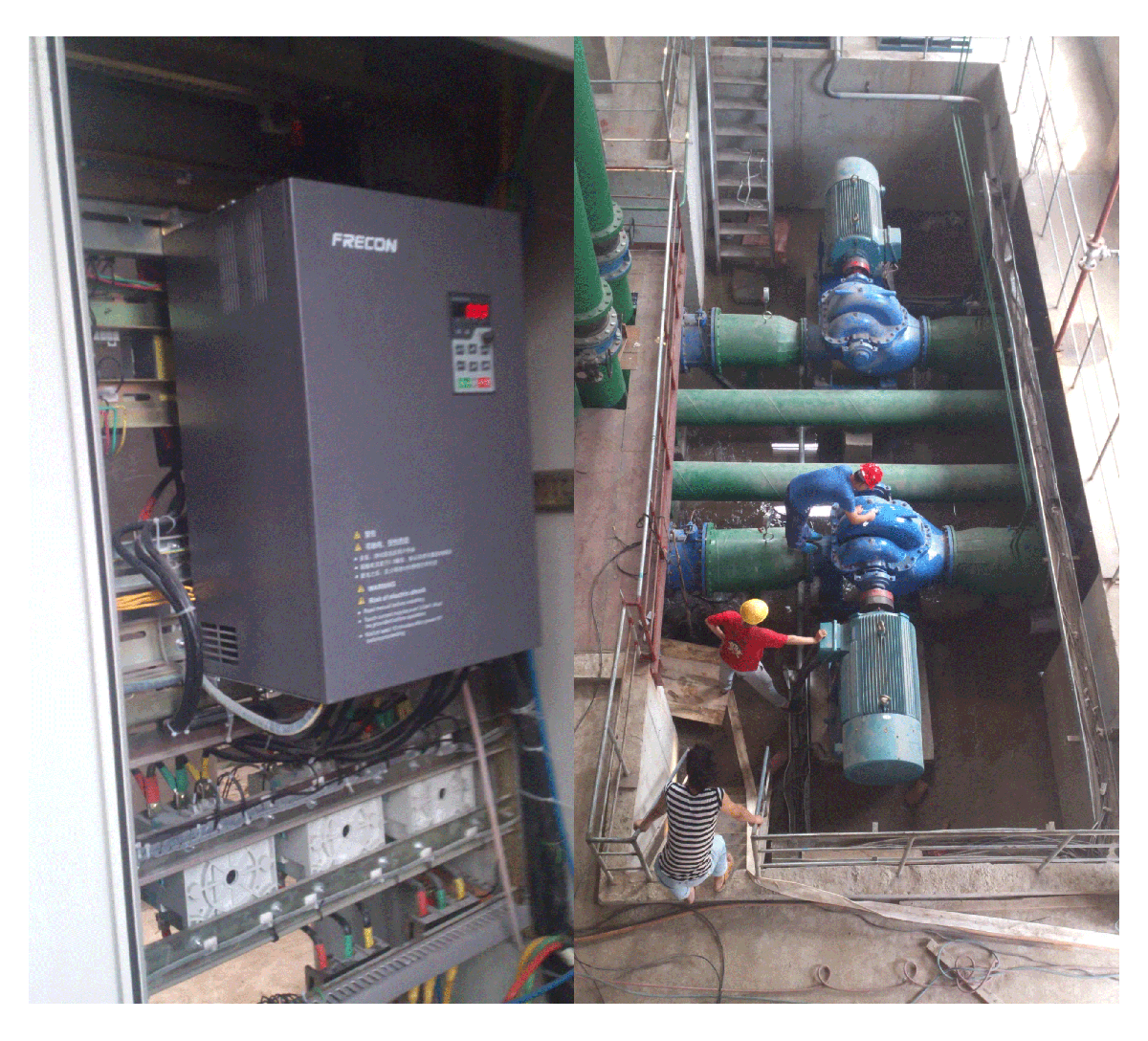针对单级真空泵的轻中负载特性与灵活调速需求,用户采用孚瑞肯 FR500 变频器进行系统改造,核心回路设计如下:(注:可替换为实际接线图,核心回路包括:三相 380V 电源→断路器→FR500 变频器→单级真空泵电机→压力传感器→现场控制箱→FR500 输入输出接口)