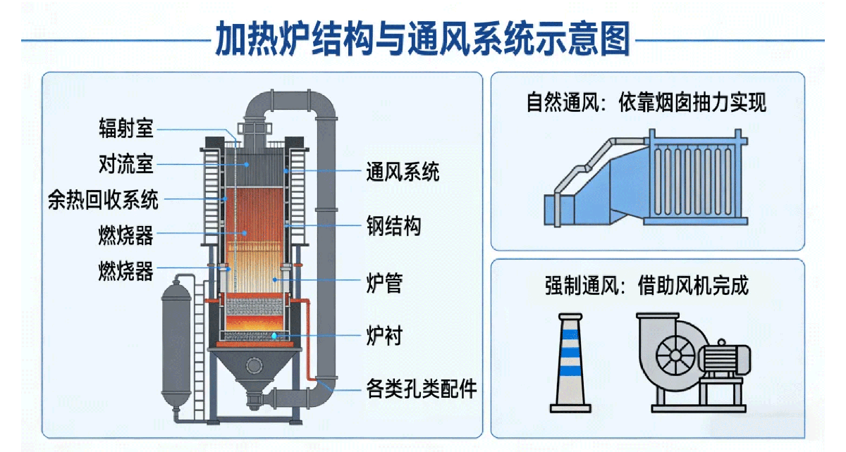 加热炉主要由辐射室、对流室、余热回收系统、燃烧器及通风系统五部分构成,整体结构还包括钢结构、炉管、炉衬、燃烧器及各类孔类配件。通风系统负责送入助燃空气、排出废烟气,分为自然通风与强制通风两类:自然通风依靠烟囱抽力实现,强制通风则借助风机完成。