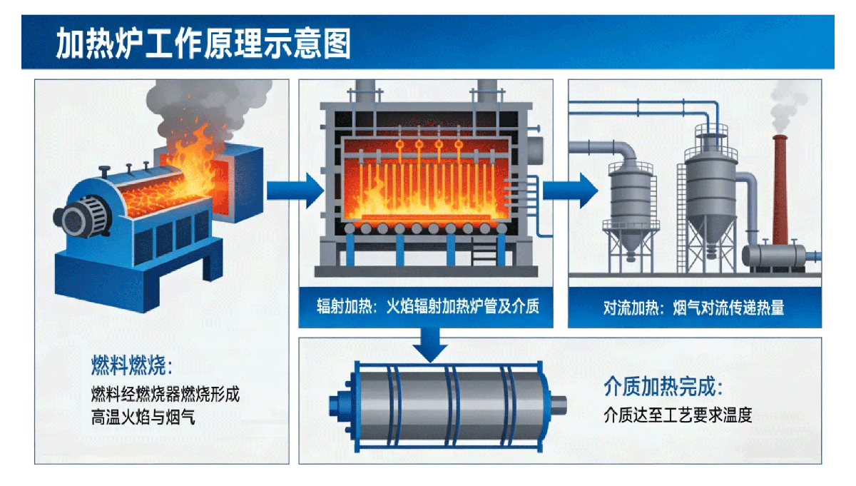 加热炉以燃料燃烧产生的高温火焰与烟气为热源,加热炉管内流动介质,使其达到工艺要求温度。燃料经燃烧器燃烧后,形成高温火焰与烟气,火焰以辐射方式在辐射室加热炉管及内部介质;烟气在烟囱抽力或引风机作用下进入对流室,再以对流方式传递热量,最终完成介质加热。