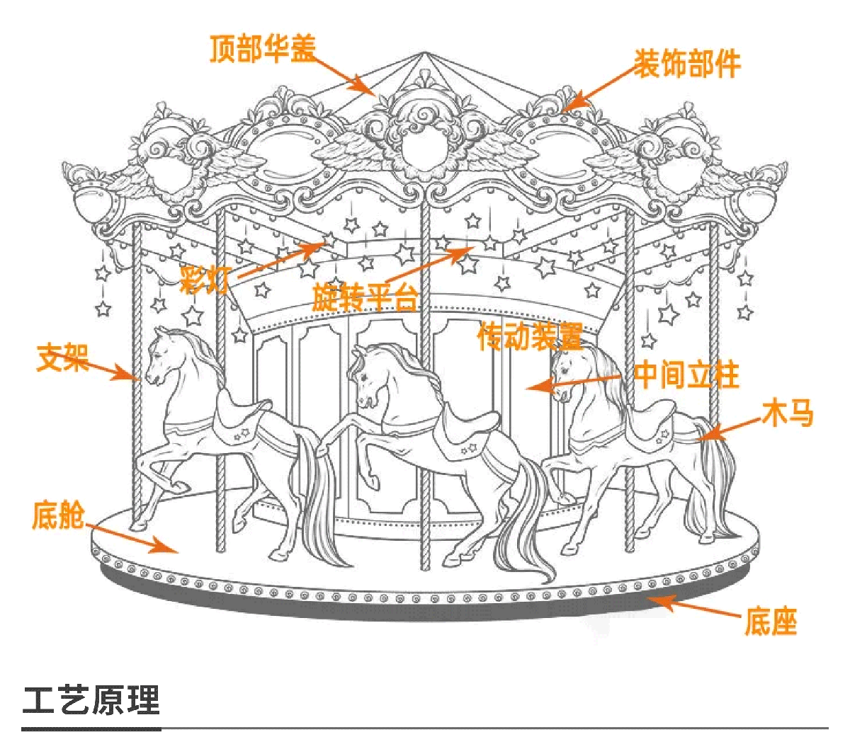 座舱与装饰组件包括座舱和装饰部件,座舱常见木马、动物造型或卡通座椅,配备安全围栏、安全带。装饰部件如顶部华盖、彩灯、音乐播放器,部分还设有背景故事主题装饰。