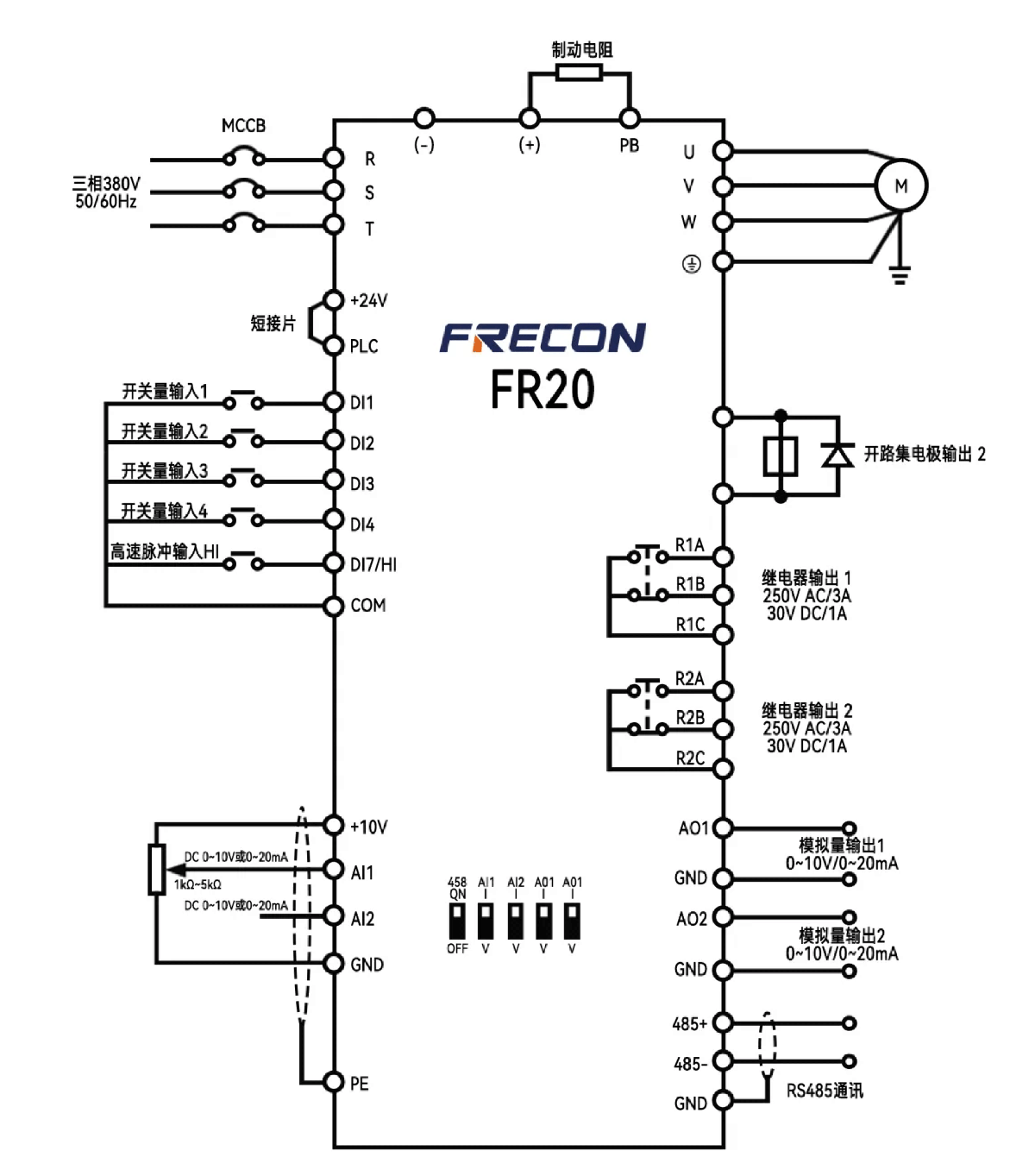 针对空气悬浮离心鼓风机的超高转速控制与节能需求,用户采用孚瑞肯 FR20 变频器进行系统配套,核心回路设计和接线图如下:
